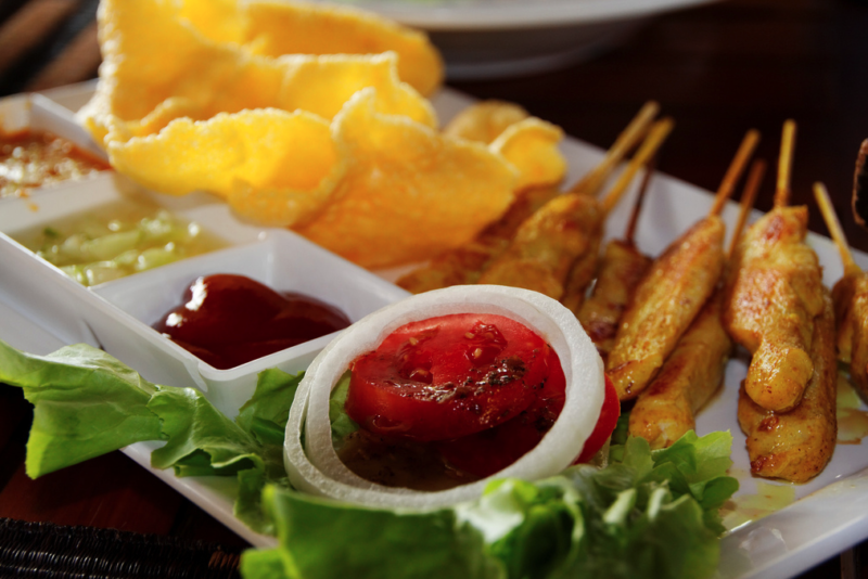 Si tratta di piccoli spiedini di pollo (si possono trovare anche altri tipi di carne, come il maiale) aromatizzati con le spezie che gli conferiranno il tipico colore giallo. Sono solitamente accompagnati da una salsa agli arachidi davvero gustosa.