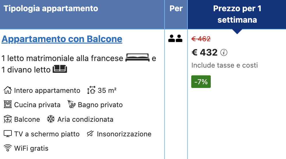 Il prezzo è di 216 euro a persona e tra i servizi inclusi troviamo il WiFi e l’aria condizionata.