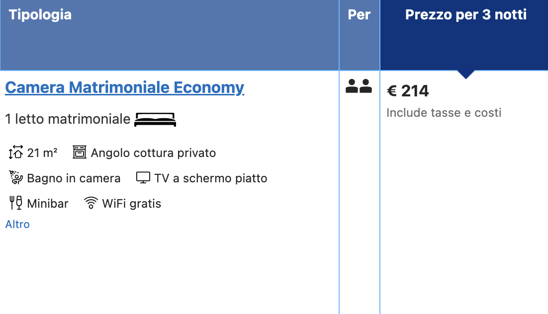 Il prezzo è di 107 euro a persona ed include un bagno in camera, il WiFi ed un angolo cottura privato.