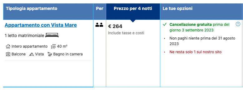 L’appartamento che vi consiglio si trova a meno di un km dalla spiaggia più famosa della zona, e a pochi km dalle attrazioni più famose! Il prezzo è di 132 euro a persona e tra i servizi inclusi potrete trovare l’aria condizionata e il WiFi. Link per la prenotazione con cancellazione gratuita.