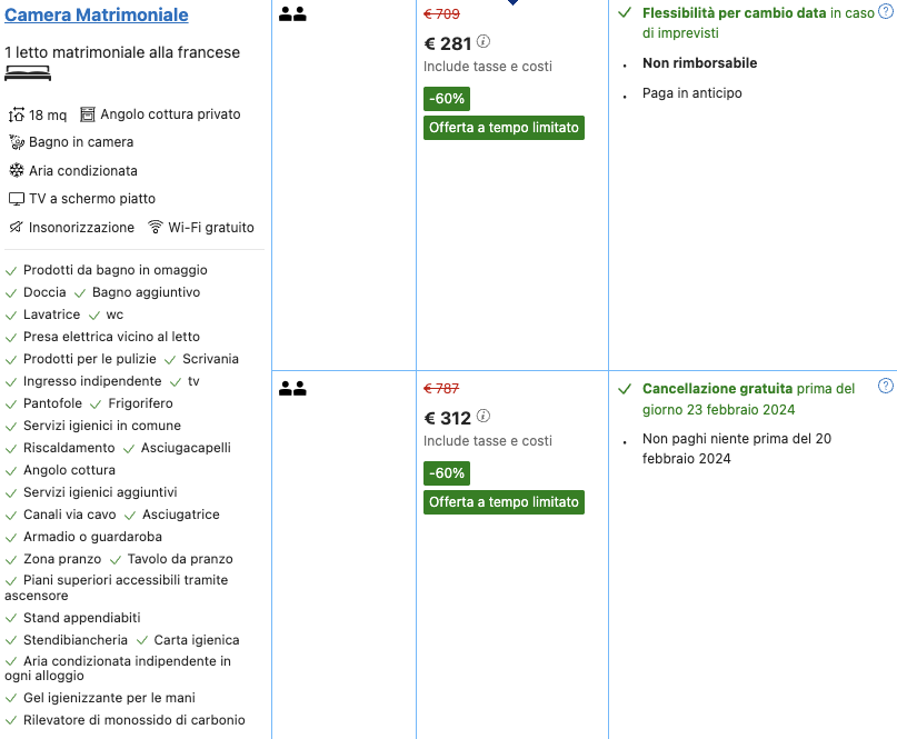 Se optate per la cancellazione gratuita entro il 23 febbraio, la tariffa è di 156 euro a persona.