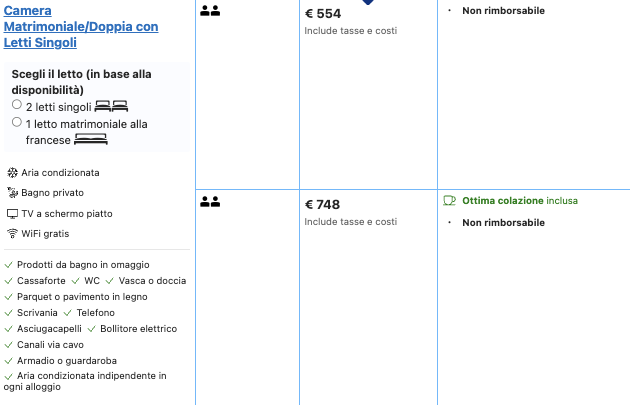 Optando per la Colazione inclusa nel prezzo, la tariffa è di 374 euro a persona