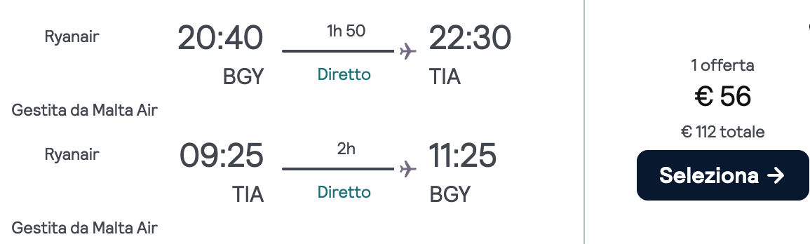 Il prezzo è di 56 euro a persona ed il volo è gestito dalla compagnia Ryanair e Malta Air.