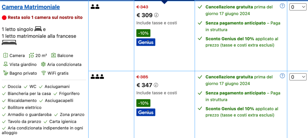 La tariffa è di 154 euro a persona, con la cancellazione gratuita prima del giorno 17 giugno 2024 con la possibilità del pagamento direttamente in struttura.