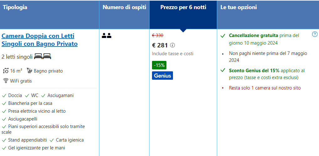 La tariffa è di 140,50 euro a persona con cancellazione gratuita prima del 10 maggio. Oltretutto, non paghi nulla fino al 7 maggio!