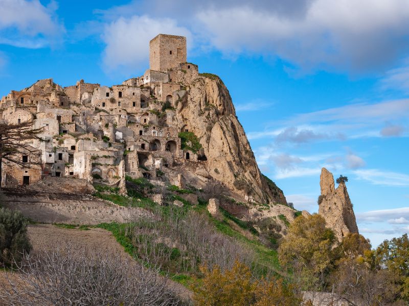 La più famosa e suggestiva città fantasma d’Italia è sicuramente Craco. Ci troviamo in Basilicata, a 390 metri sul livello del mare, nel cuore dell’Appennino Lucano. Qui, su uno sperone di roccia circondato da calanchi, sorge un piccolo borgo, oggi conosciuto come Craco Vecchia. Esiste infatti una seconda località, situata più a valle, chiamata Craco Peschiera, dove si sono trasferiti sia gli abitanti che l’amministrazione comunale di Craco.