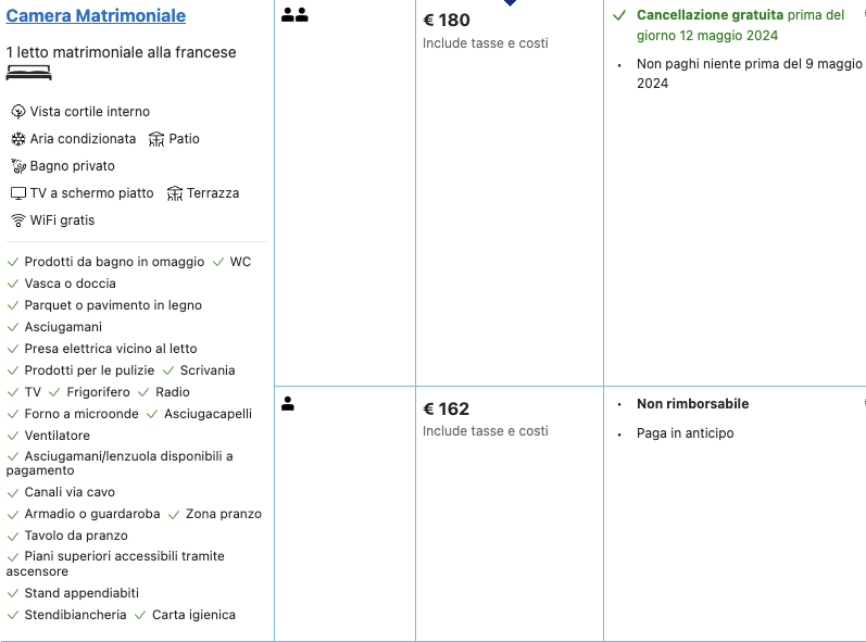 Optando per la cancellazione gratuita entro il 12 maggio senza pagamento anticipato prima del 9 maggio la tariffa è di 90 euro a persona.